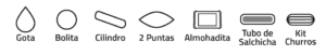 FORMAS: Gota/ Bollita/ Cilindro/ 2 Puntas/ Almohadita/ Tudo de Salsicha/ Kit Churros